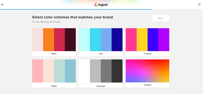 4. Selanjutnya, anda akan di bawah ke “Select color schemes that matches your brand” untuk memilih warna yang ingin digunakan pada logo Anda. Lalu klik “Continue”.