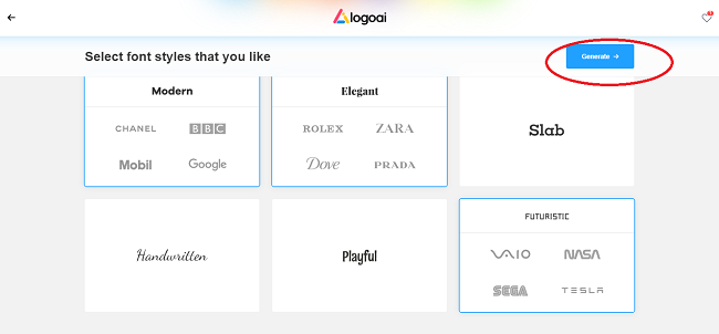 5. Pilih gaya desain font yang diinginkan di halaman “Select font styles that you like”. Logoai.com menawarkan beberapa opsi gaya desain, seperti modern, elegant, slab, handwritten, dan lain sebagainya. Anda juga bias memilih beberapa desain font untuk dikombinasikan. Setelah itu klik “Generate”.