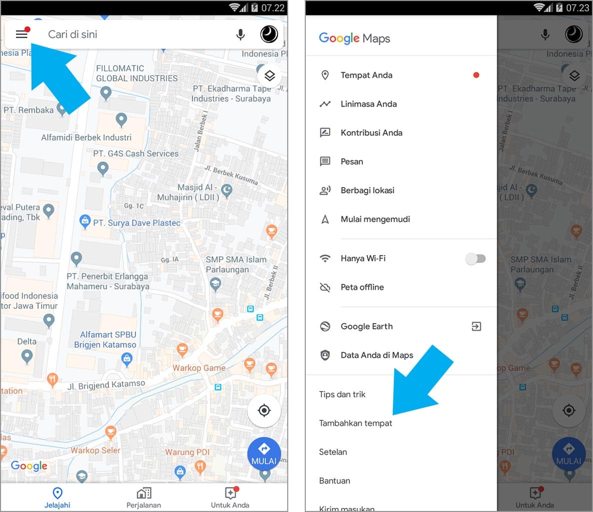 2. Ketuk tiga garis horizontal yang terletak di pojok kiri atas, kemudian pilih tambahkan tempat.