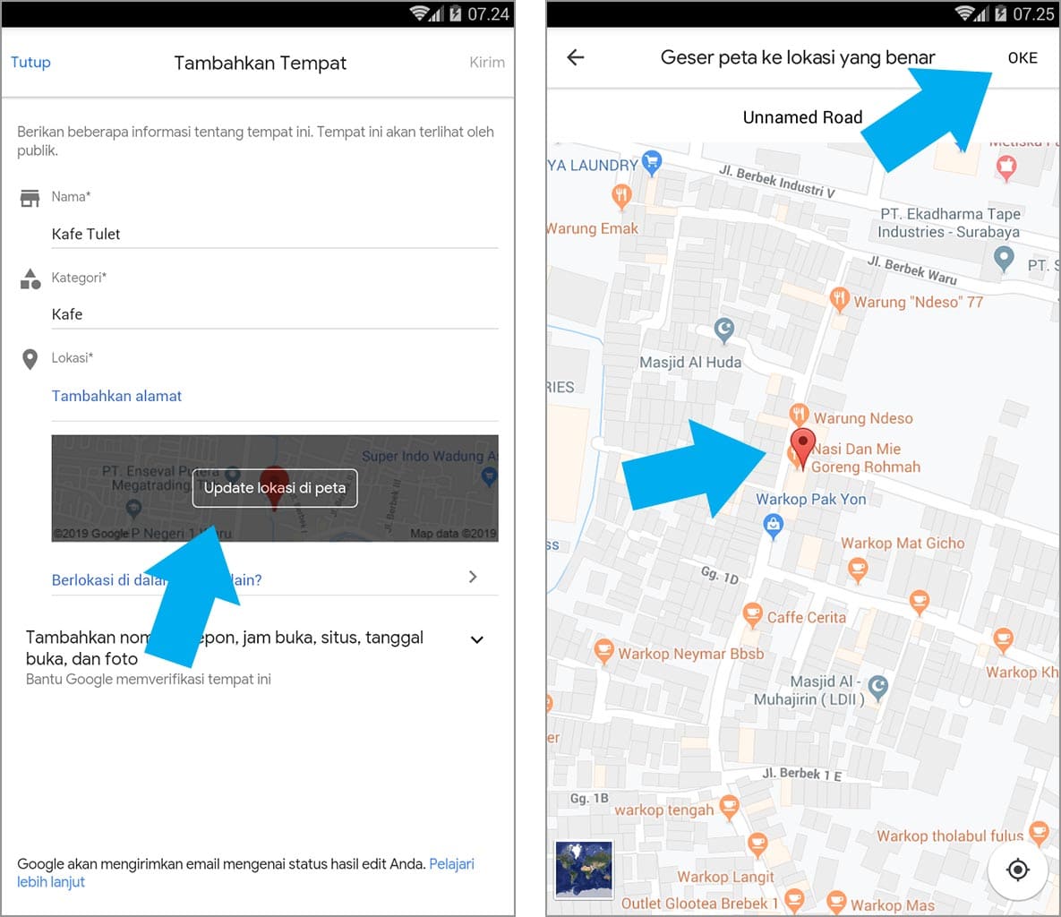 4. Untuk menambahkan lokasi pada peta, silakan ketuk update lokasi di peta. Kemudian, silakan geser pin hingga menemukan posisi yang sesuai, setelah itu ketuk oke.