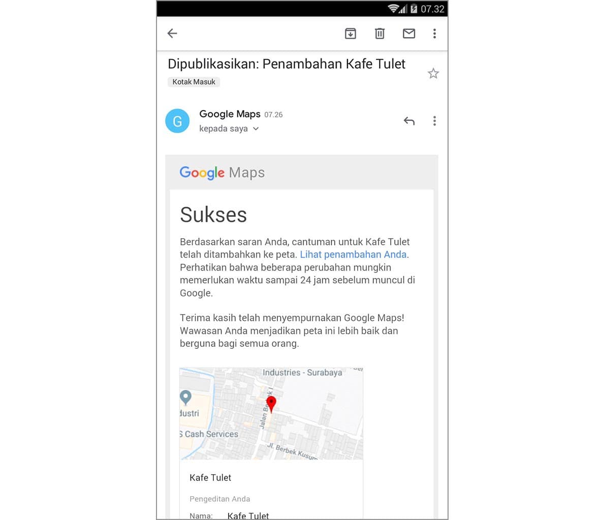 6. Buka Gmail yang kamu gunakan untuk mendaftar aplikasi Google Maps. Jika penambahan tempat disetujui, kamu akan mendapatkan email pemberitahuan dari Google.