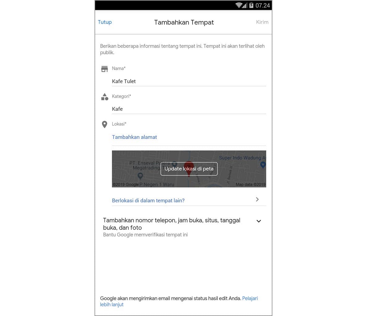 5. Kamu juga bisa menambahkan nomor telepon, jam buka, hingga alamat situs. Namun, itu hanya opsional sifatnya – kirim.