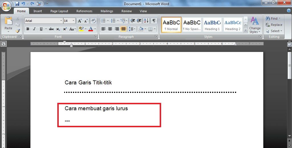 Salah satu tampilan yang sering digunakan pada dokumen Ms.Word adalah tampilan garis. Namun sayangnya, masih banyak pengguna yang menggunakan cara manual untuk membuat garis di dokumen Ms.Word. Sebelumnya untuk membuat garis lurus di dokumen Ms.Word kita akan menggunakan ikon Line di menu Shape Insert. Tapi ada cara mudah membuat garis lurus di dokumen Ms.Word yaitu dengan mengetikkan ikon-ikon yang ada di keyboard. Selain membuat garis lurus kita juga bisa membuat garis titik-titik, garis untuk kop surat, garis tebal dan dua garis.Â