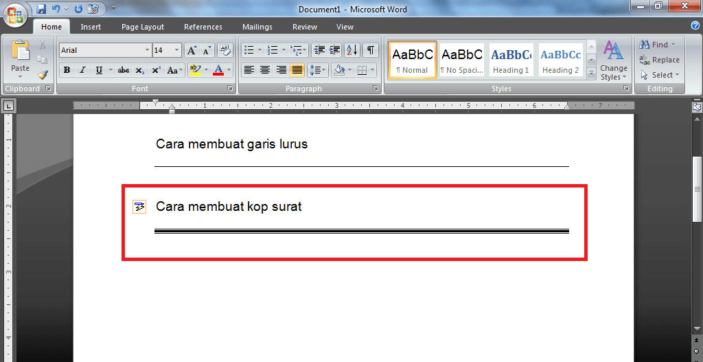Selesai, berikut tampilan garis untuk kop surat di dokumen Ms.Word.