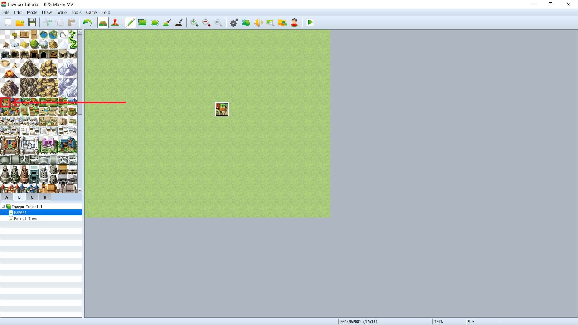 2. Pindahkan view kita ke map awal kita dengan cara klik kiri pada pilihan MAP001 di bawah inwepo tutorial. Lalu ubah view menjadi map editing mode.