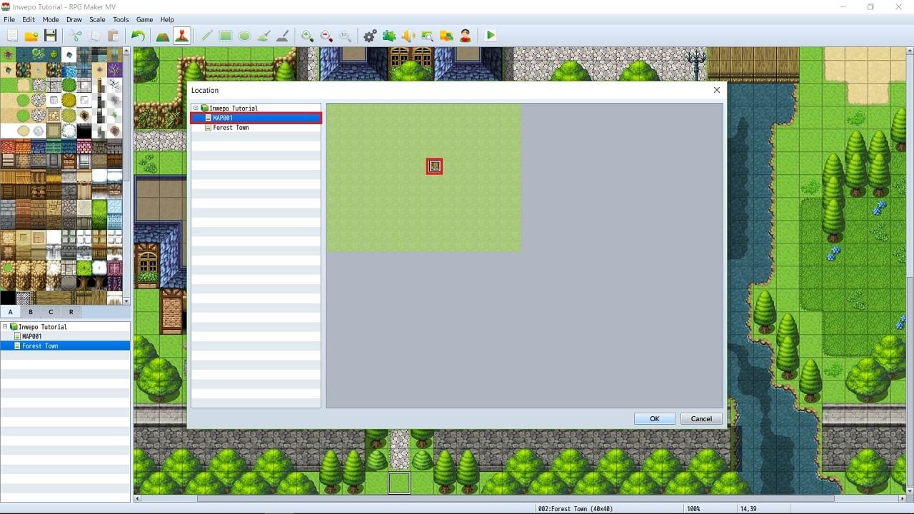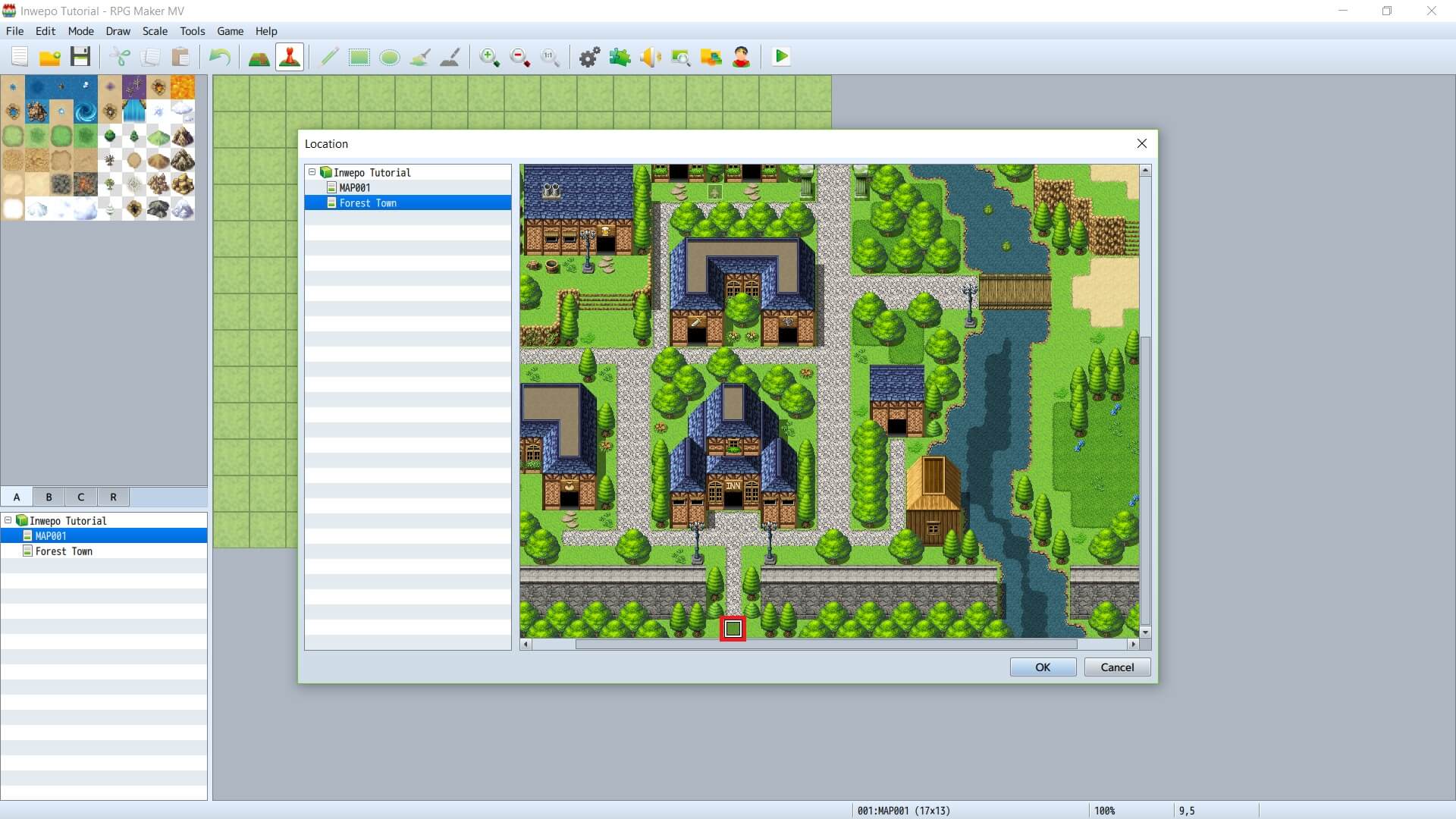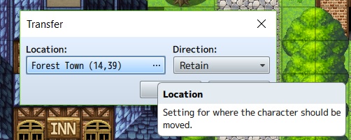 6. Akan muncul kotak dimana kita bisa mengkonfigurasi dimana karakter kita akan berpindah ketika karakter kita menginjak kotak tersebut. Klik kiri pada location.