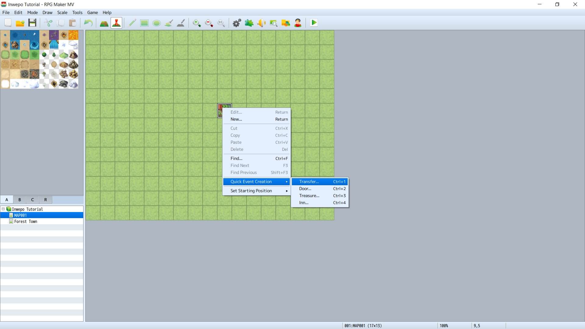 8. Jika sudah, kita kembali ke view MAP001. Lalu lakukan hal yang sama pada ikon rumah yang ada. Klik kanan lalu pilih quick event creation lalu pilih transfer.