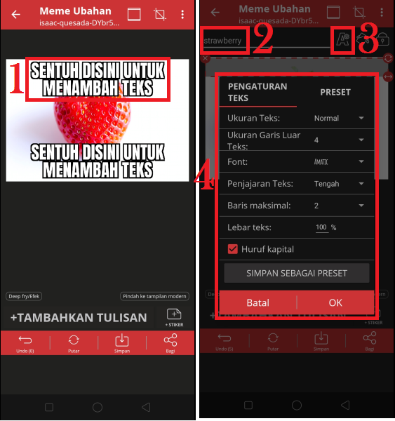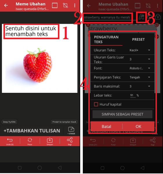 5. Untuk menambahkan teks pada bagian atas meme, klik saja teks ‘sentuh disini untuk menambahkan teks’. Tulis teks. Klik ikon ‘Setting Teks’ untuk mengubah jenis huruf, ukuran huruf, dan lebar teks. Klik ok. Lakukan hal serupa untuk menambahan teks pada bagian bawah meme.