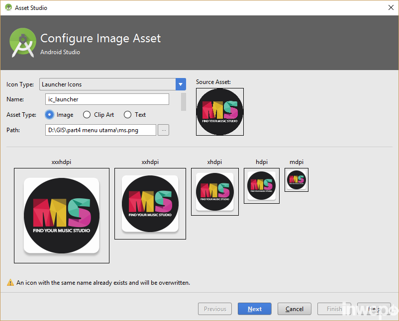 Ganti Asset Type menjadi Image, lalu cari path gambar icon pada PC kalian. Tidak perlu mengubah nama, biarkan ic_launcher kemudian next > finish. Selanjutnya jalankan aplikasi.