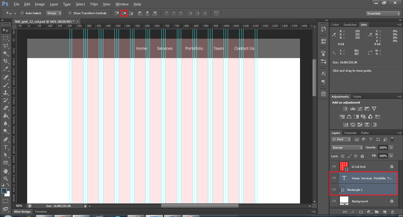 14. Kemudian untuk mengatur supaya menu nya terlihat rapih di navbar, pilih kedua layer text dan rectangle dan atur posisinya align vertical centers dan hasil nya akan menjadi seperti ini. Perlu diingat ketika ingin mengatur ini pastikan pembaca menggunakan tools Move atau dapat menekan tombol V pada keyboard, jika tidak maka pilihan Align untuk mengatur posisi tidak akan muncul.