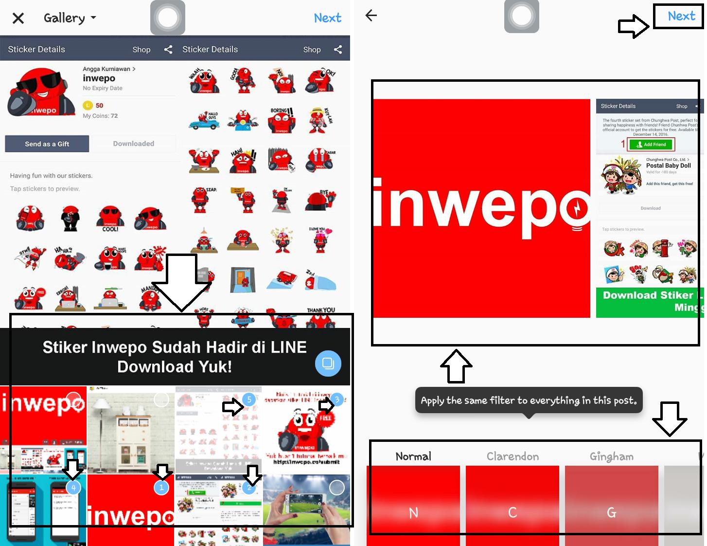 6. Pada tahap ini anda juga anda hanya bisa menambahkan filter yang sama untuk semua gambar, dan jika anda ingin meilhat gambar cukup dengan swipe ke kanan.Tap next untuk melanjutkan ketahap berikutnya.