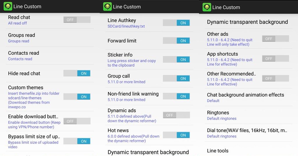 info stiker, LINE authkey, membuka batas upload video, membuka batas text/chat reply lebih dari 1000 karakter, theme changer dan efek background animasi.
