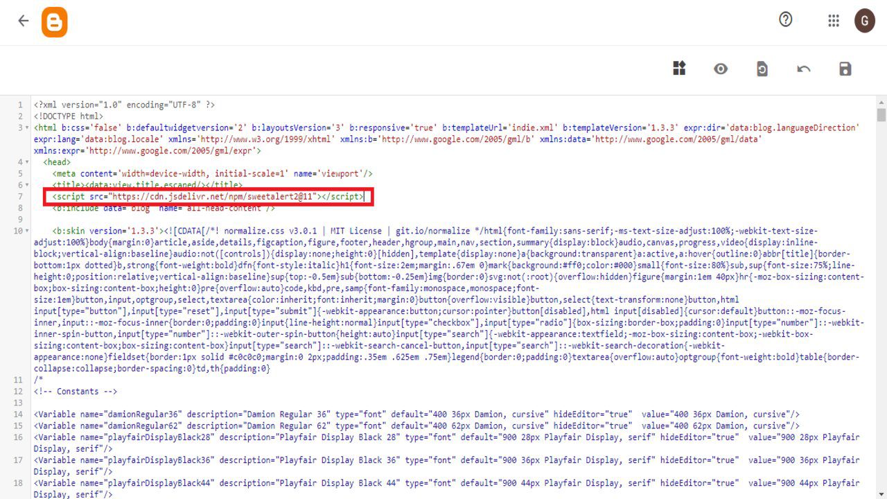 3. Kembali pada edit html nya. Sekarang, kamu copy dan paste script CDN tersebut untuk di taruh pada bagian setelah tag <head> di blogspot kamu :