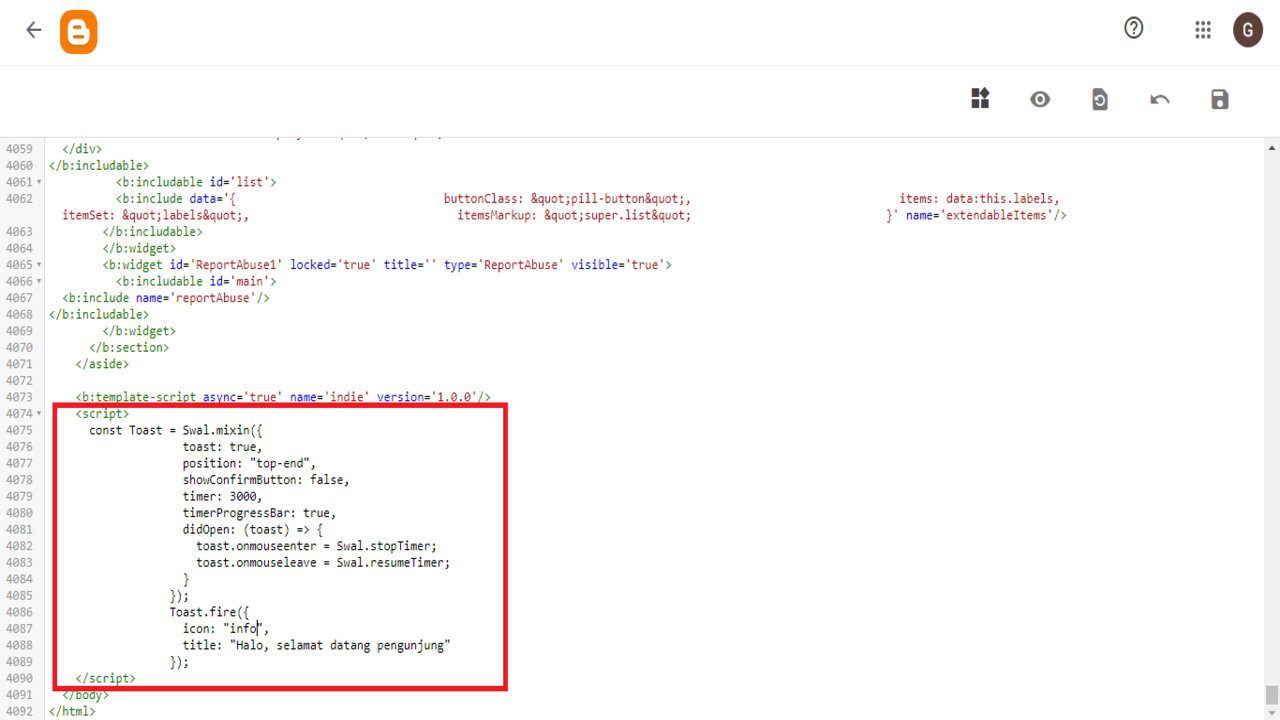 Perlu di ingat, ini masih tetap berada pada edit html. Setelah kode di atas sudah di copas kamu scroll ke bawah sebelum tag </body> untuk di taruh kode nya seperti ini :