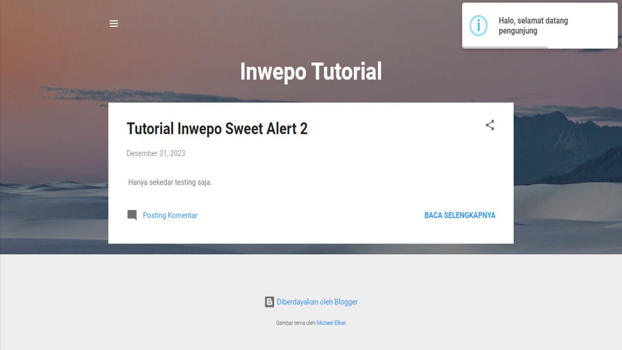 Penulis akan membuat notifikasi yang di sediakan oleh sweet alert 2 yaitu ketika pengunjung mengunjungi blog kamu maka akan mengirimkan pesan notifikasi yang akan di tampilkan pada blog. Sebelum itu penulis akan memberikan penjelasan lengkap nya apa itu sweet alert 2.