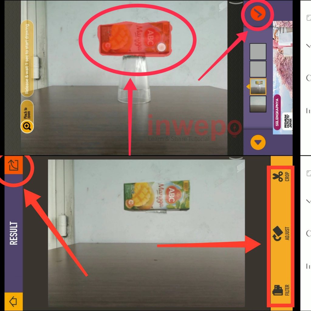 4. Langkah keempat, tap ceklis bila sudah selesai menyeleksi bagian objek yang ingin dibuat melayang. Gunakan menu lain seperti Filter, Crop, dan juga Adjust untuk mempercantik hasil editan kamu. Jika semua dirasa sudah cukup tap icon panah yang berada di pojok kanan atas.