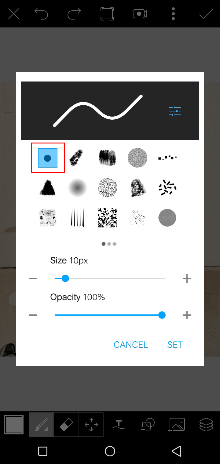 3. Lalu, pilih tap ikon brush dengan posisi paling kiri dan paling atas. sesuaikan size atau ukuran besar kecilnya outline yang akan diberikan, serta naikan opacitynya hingga 100%. Misalnya seperti ini.