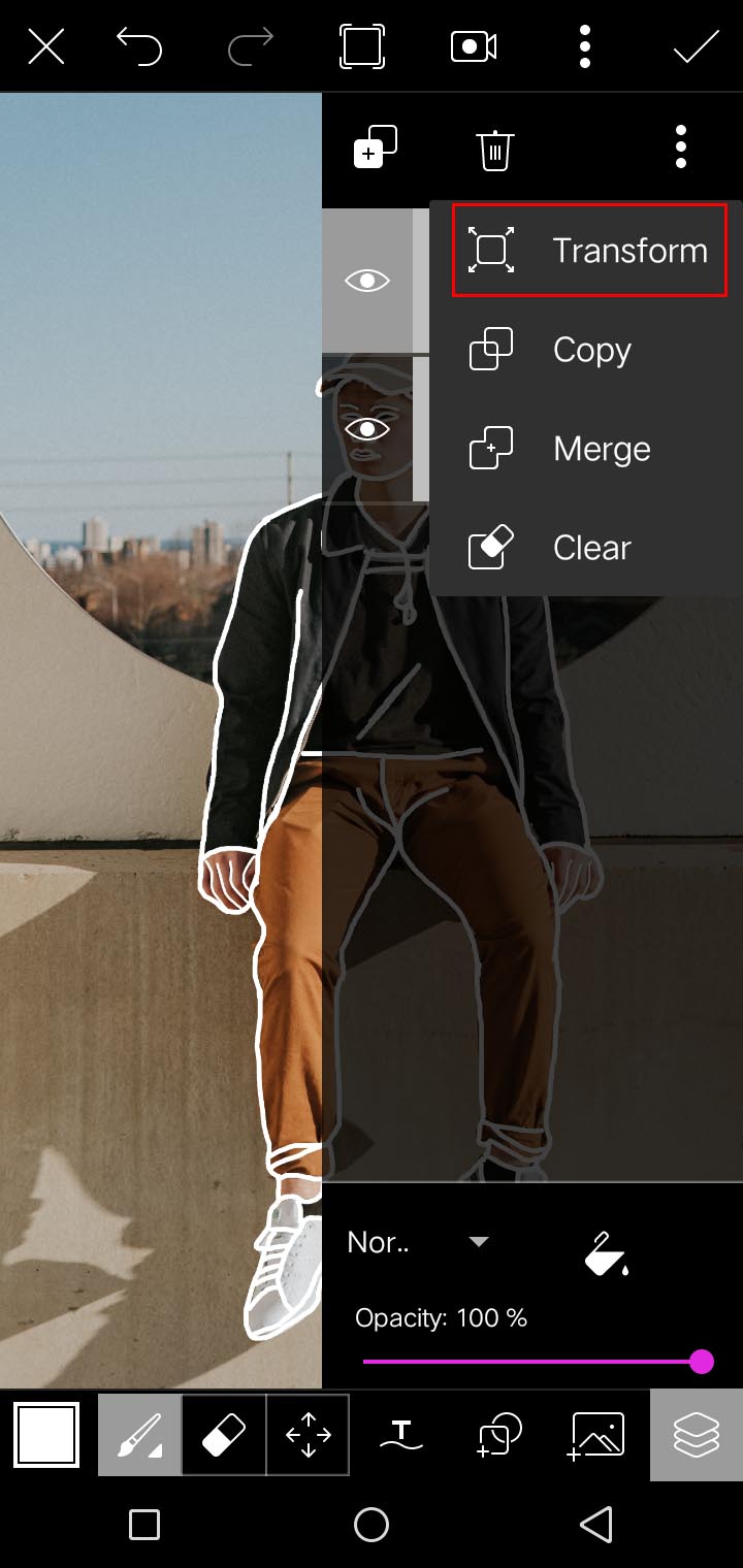 kemudian pilih transform yang terdapat titik tiga pada ujung kanan atas aplikasi.