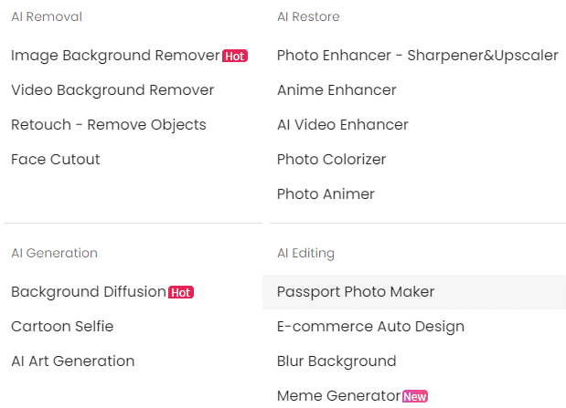 Di dalamnya terdapat berbagai fitur seperti Photo Animer, AI Video Enhancer, Passport Photo Maker/ID Photo Maker, Photo Colorizer dan lain-lain. Nah, di sini kita akan menggunakan fitur ID Photo Maker miliknya.
