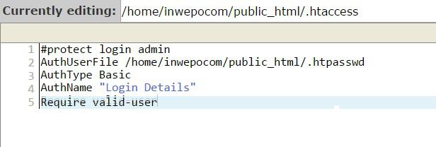 keterangan: ganti nama user inwepocom yang bertanda merah dengan nama user hosting yang kamu gunakan dan simpan file .htpasswd sesuai folder proteksi yang kamu buat.