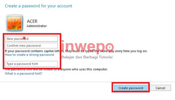 5. Dan kamu masukkan kata sandi kamu pada kolom yang telah disediakan dan kamu masukkan hint atau petunjuk mengenai isi dari kata sandi kamu, hint bertujuan untuk mempermudah kamu mengingat kata sandi kamu jika suatu saat kamu lupa kata sandi kamu.