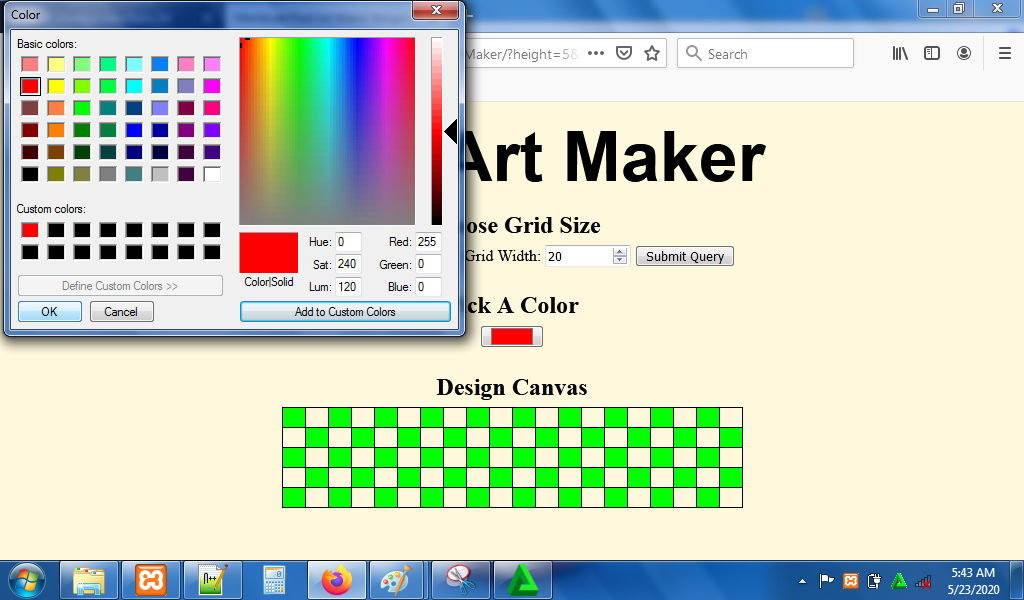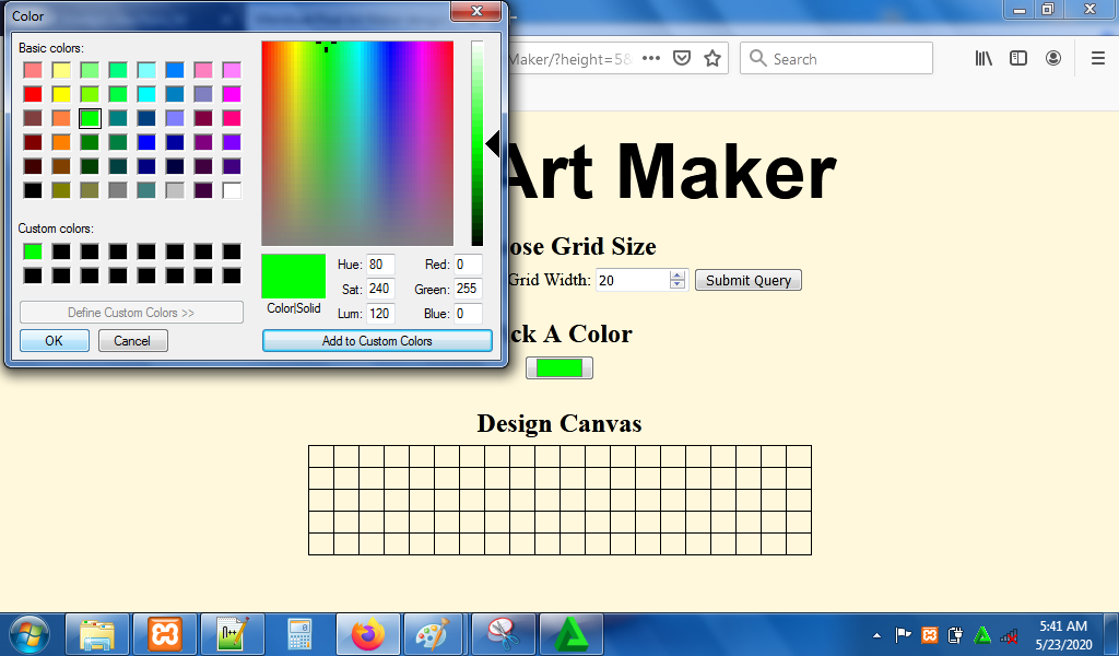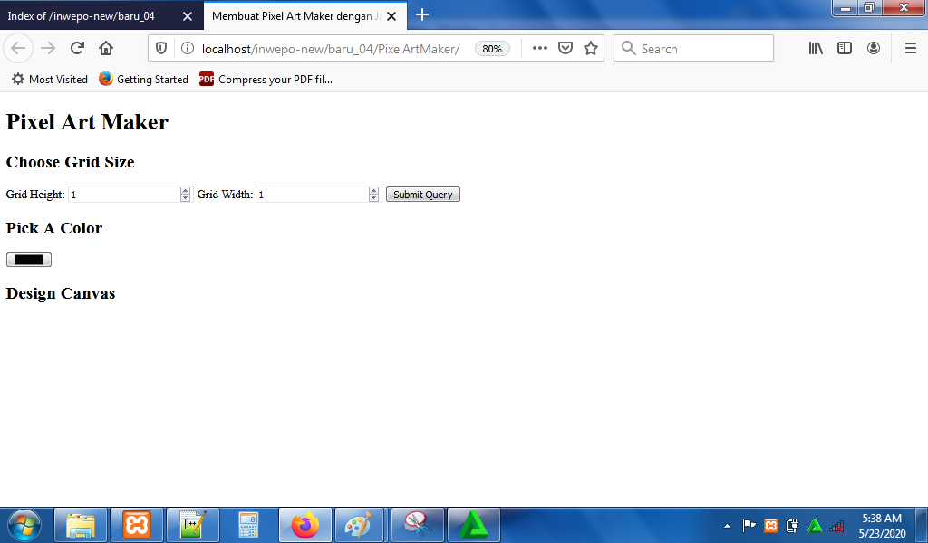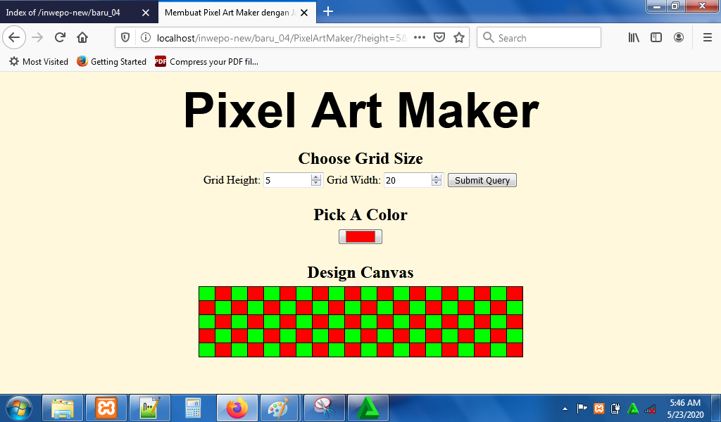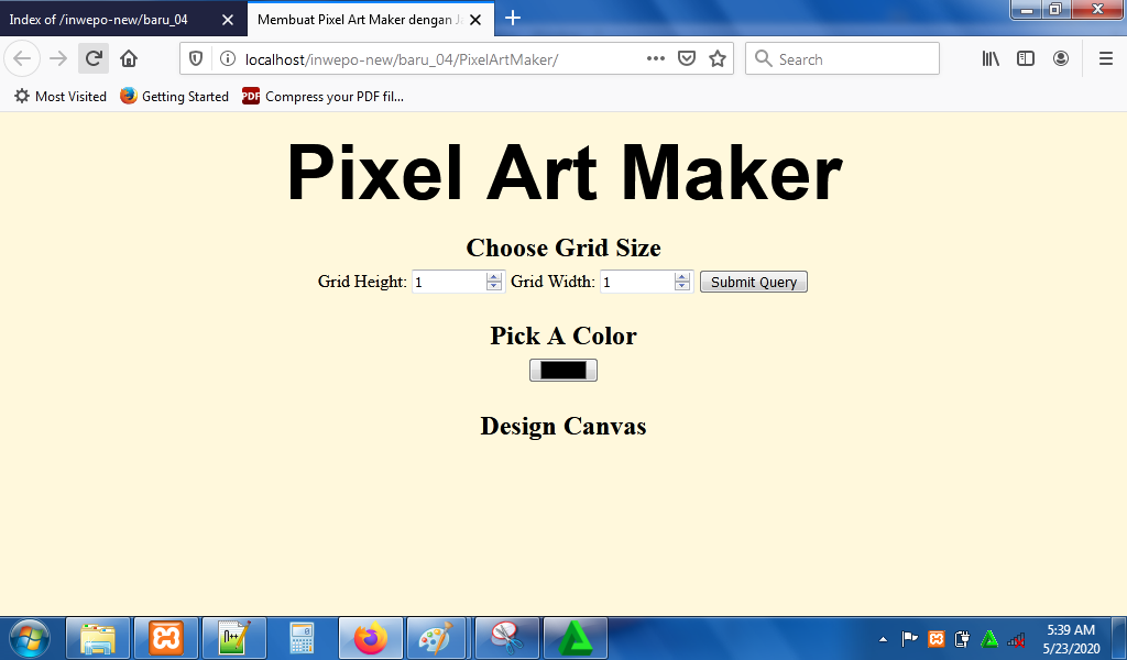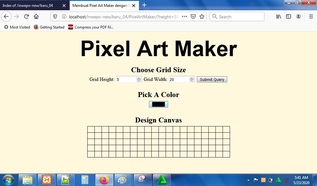 7. Reload alamat url : http://localhost/PixelArt. Masukkan nilai grid height dan grid width untuk membuat kotak-kotak kecil.
