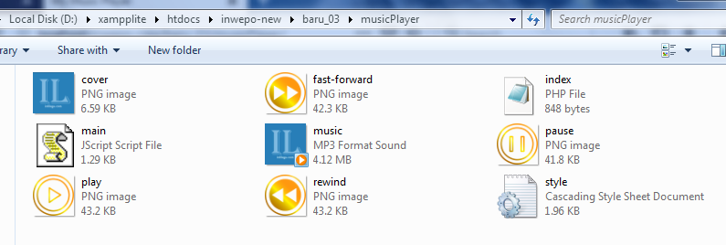 Simpan kode HTLM5 di atas di folder xampplite – htdocs – buat folder baru dengan nama PlayerMusic – simpan kode di atas dengan nama index.html.