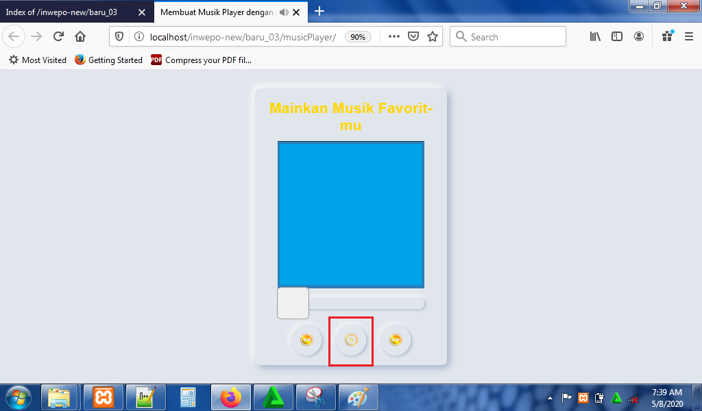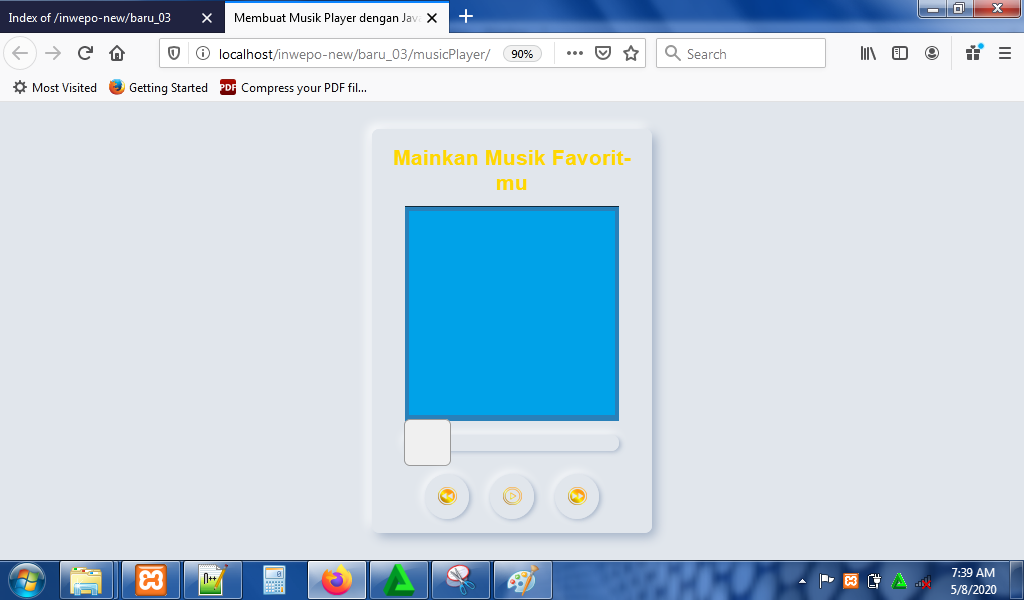 8. Reload alamat url : http://localhost/PlayerMusic. Tampilan music player. Klik tombol play untuk memainkan music.