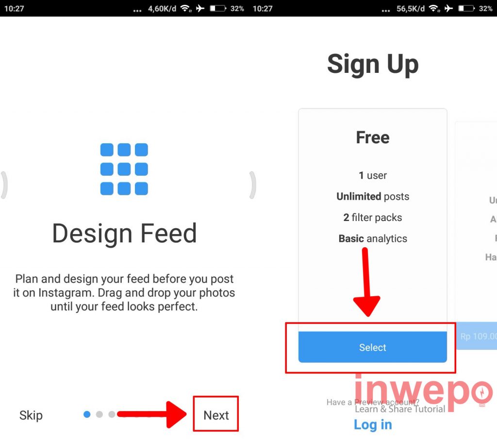 2. Langkah kedua, buka aplikasi Preview lalu tap Next selanjutnya Sign Up ke aplikasi Preview pilih Free kemudian tap Select.