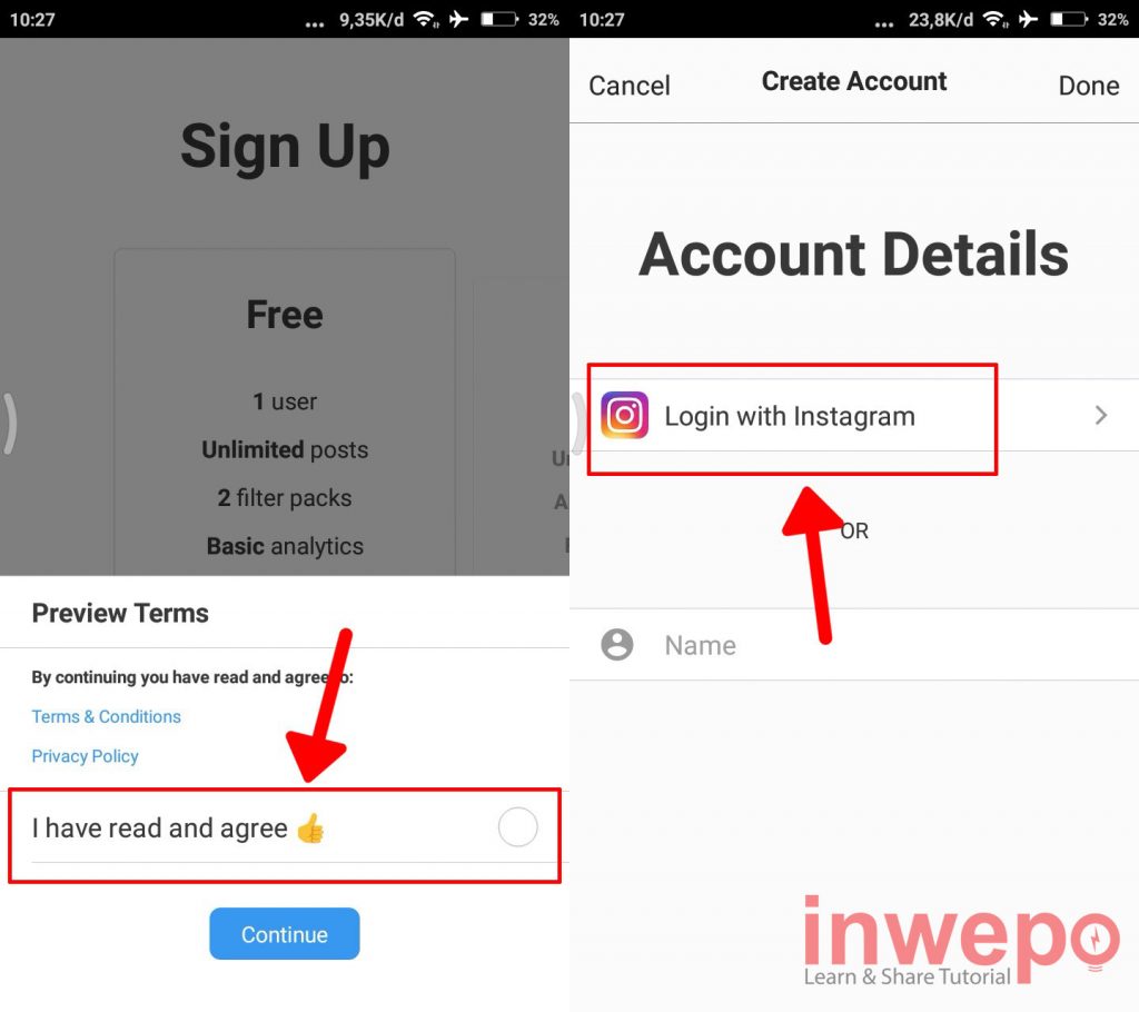 3. Langkah ketiga, ceklis I have read and agree kemudian tap Continue berikutnya Login atau masuk menggunakan akun Instagram kamu.