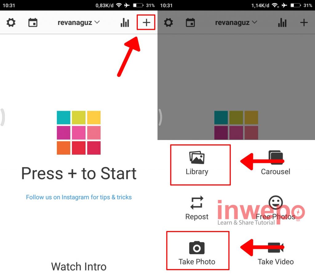 4. Langkah keempat, tap ikon plus yang berada di pojok kanan atas lalu tap Library untuk menambahkan foto dari galeri smartphone atau pilih Take Photo untuk mengambil foto langsung dari kamera.