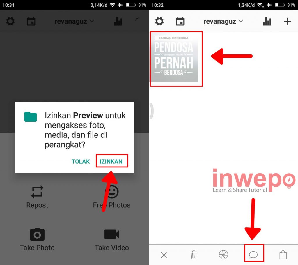 5. Langkah kelima, tap IZINKAN agar bisa mengambil atau memilih foto dari perangkat. Selanjutnya tap dan tahan foto yang sudah di pilih kemudian tap icon bubble.