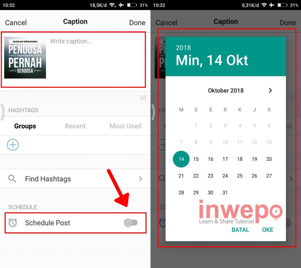 6. Langkah keenam, tulis caption kamu pada kolom yang sudah disediakan, lalu aktifkan tombol Schedule Post dan atur tanggal upload serta jam sesuai keinginan kamu.