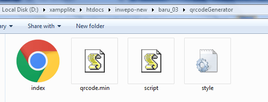 Simpan kode HTLM5 di atas di folder xampplite – htdocs – buat folder baru dengan nama QrcodeGeneration – simpan kode di atas dengan nama index.html.