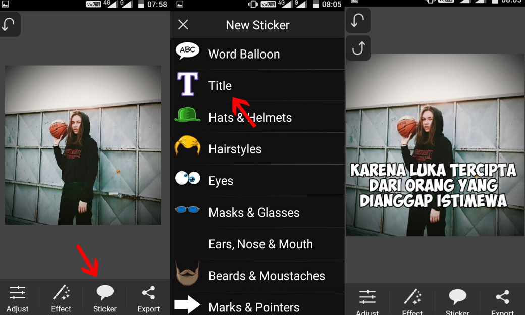 2. Selanjutnya buat tulisan Quotenya. Pilih menu Sticker – Title – Pilih font Obelix yang sudah di download tadi – Isi Quote dan letakkan di tengah.