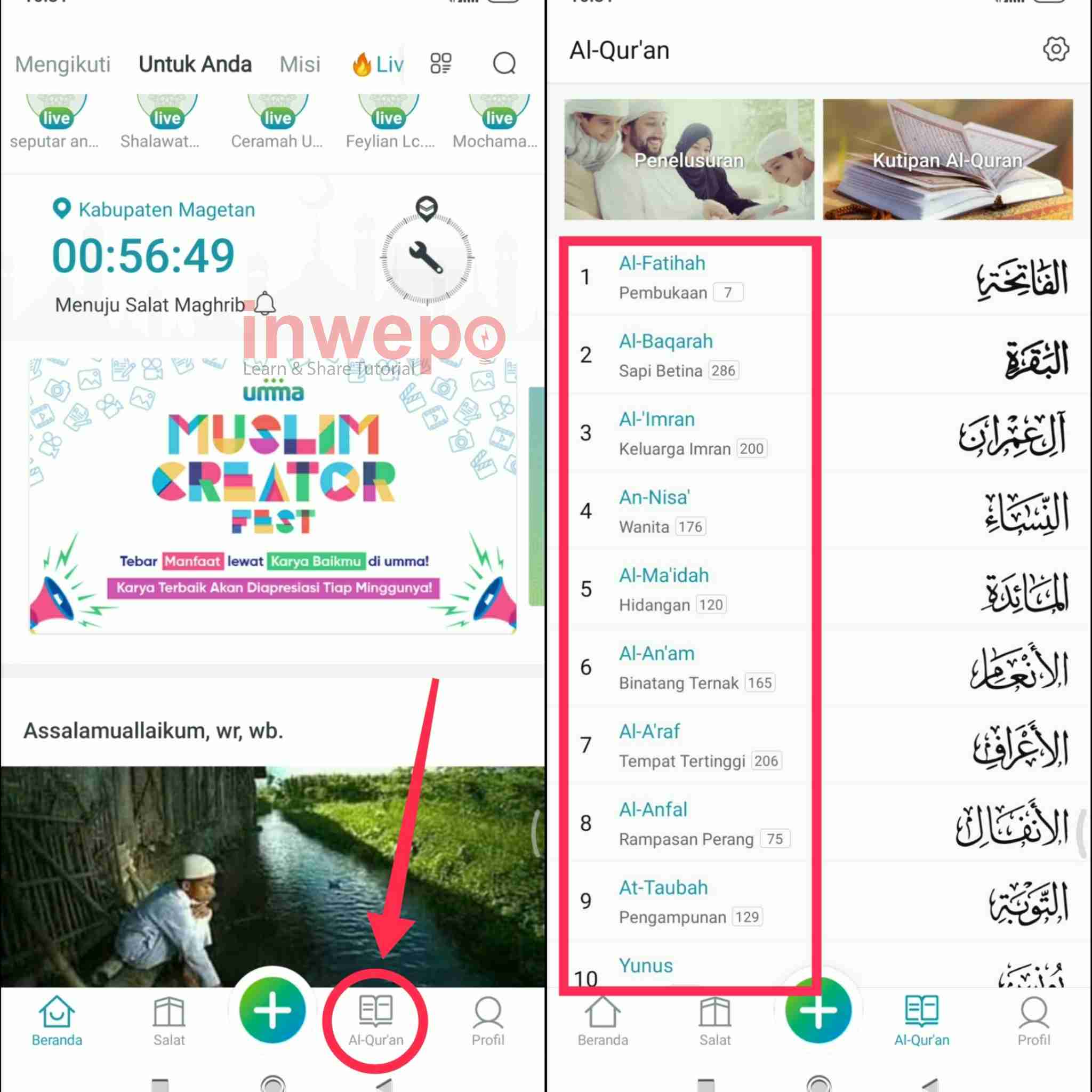 3. Langkah ketiga, di layar awal aplikasi umma langsung tap menu Al Qur’an. Berikutnya tap pilih salah satu surat yang ingin kamu buat Quote.