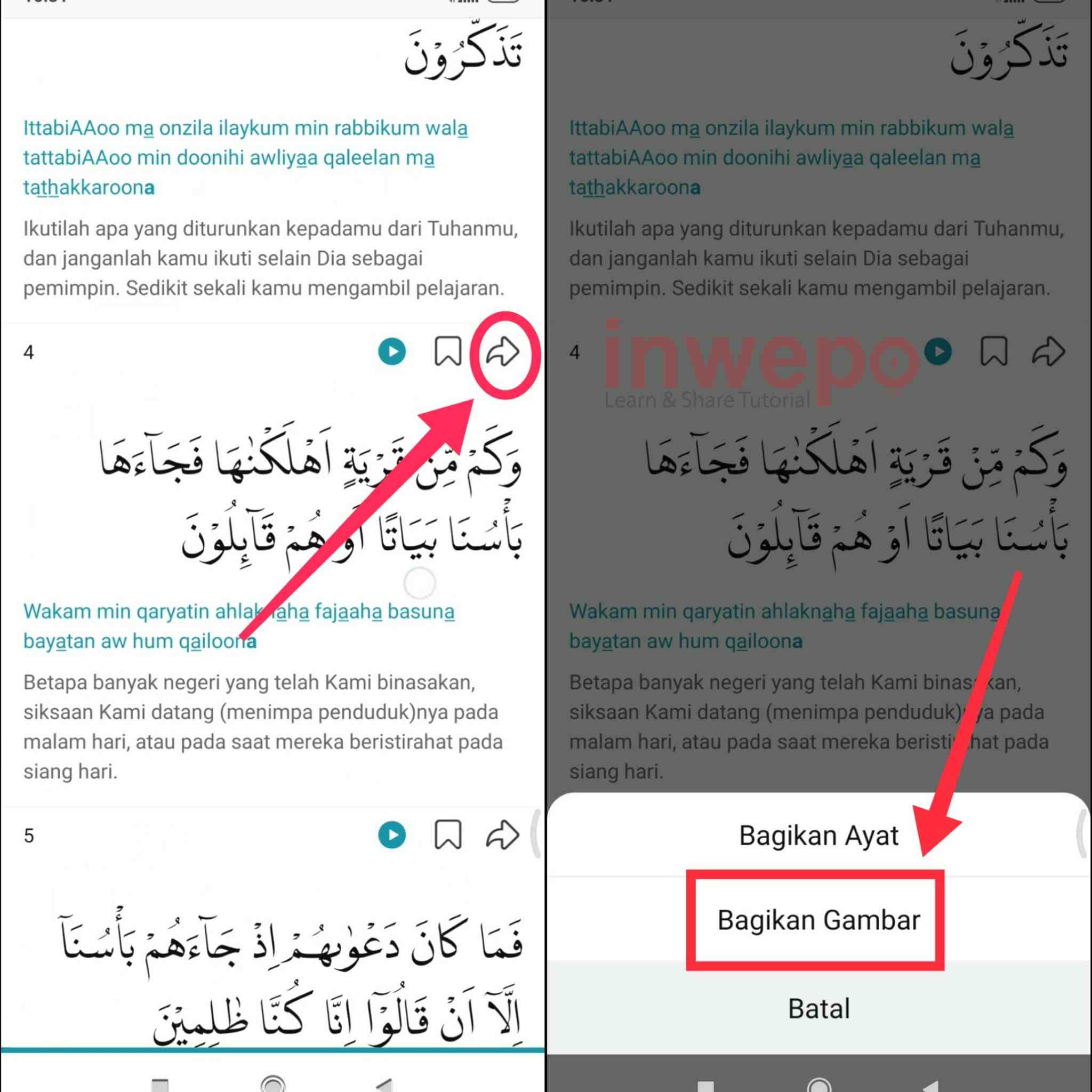 4. Langkah keempat, pilih salah satu ayat kemudian tap icon panah. Selanjutnya tap menu Bagikan Gambar untuk mulai membuat Quote.
