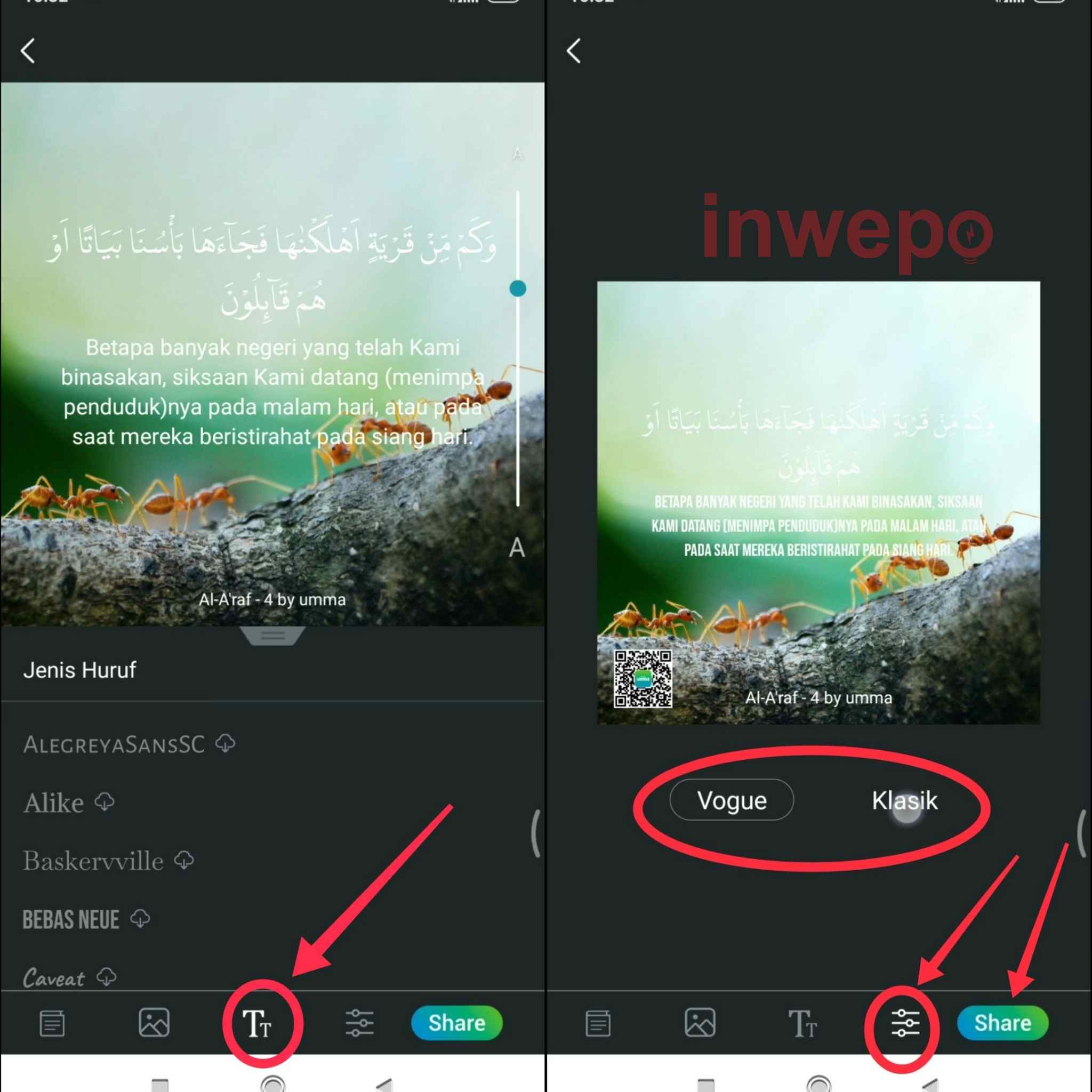 6. Langkah keenam, tap icon T untuk mengganti jenis style font yang digunakan, lalu tap icon garis atau setting untuk memilih tampilan. Nanti akan muncul 2 bentuk tampilan yakni Vogue dan Klasik. Terakhir tap share untuk membagikan Quote Quran kreasi mu.