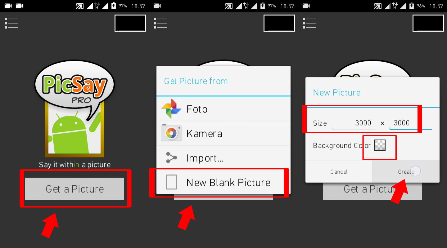 2. Jalankan aplikasi PicSay, Tap Get a Picture – New Blank Picture – Masukan skala 3000 × 3000 dengan latar transparan – Creat. Mengenai ukuran bisa disesuaikan sesuai keinginan kamu, namun harus perlu diperhatikan bahwa skala yang sama dan ukurannya tidak terlalu kecil.