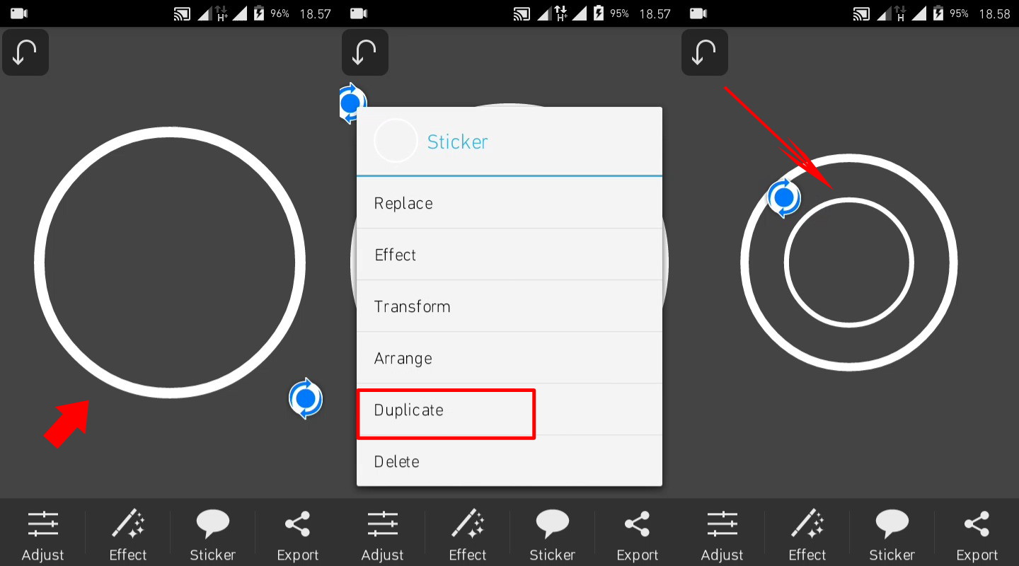 4. Setelah shapes yang kamu pilih muncul, Tap pada bulatan yang berada di shape tersebut, lalu pilih duplicate dan perkecil tampilan layar shapes dengan menggunakan dua jari lalu perkecil salah satu shapesnya sehingga akan muncul dua shape yang berbeda bentuk seperti gambar tersebut.