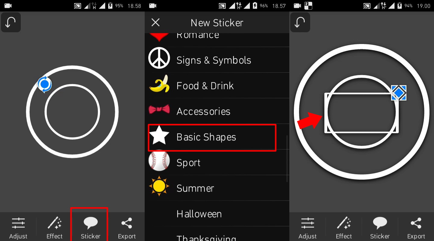3. Langkah selanjutnya adalah memasukan sticker shapes dengan cara – Tap pilihan sticker – Basic Shapes – Pilih Shapes bulat. Pastikan kamu memilih efek shapes line atau hanya garis bulat, atau kamu bisa memilih shape sesuai yang kamu inginkan. Pada tutorial kali ini saya menggunakan shape lingkaran.