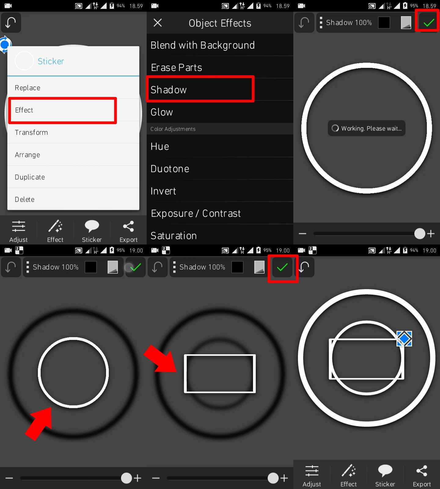 6. Pada tahap ini yaitu pemberian efek shadow atau bayangan pada sticker shapes yang berwarna seperti pelangi. Tap satu persatu shapes – efect – shadow. Kamu bisa memulainya dari shapes mana saja, setelah itu Tap icon ceklist yang berada di pojok kanan atas.