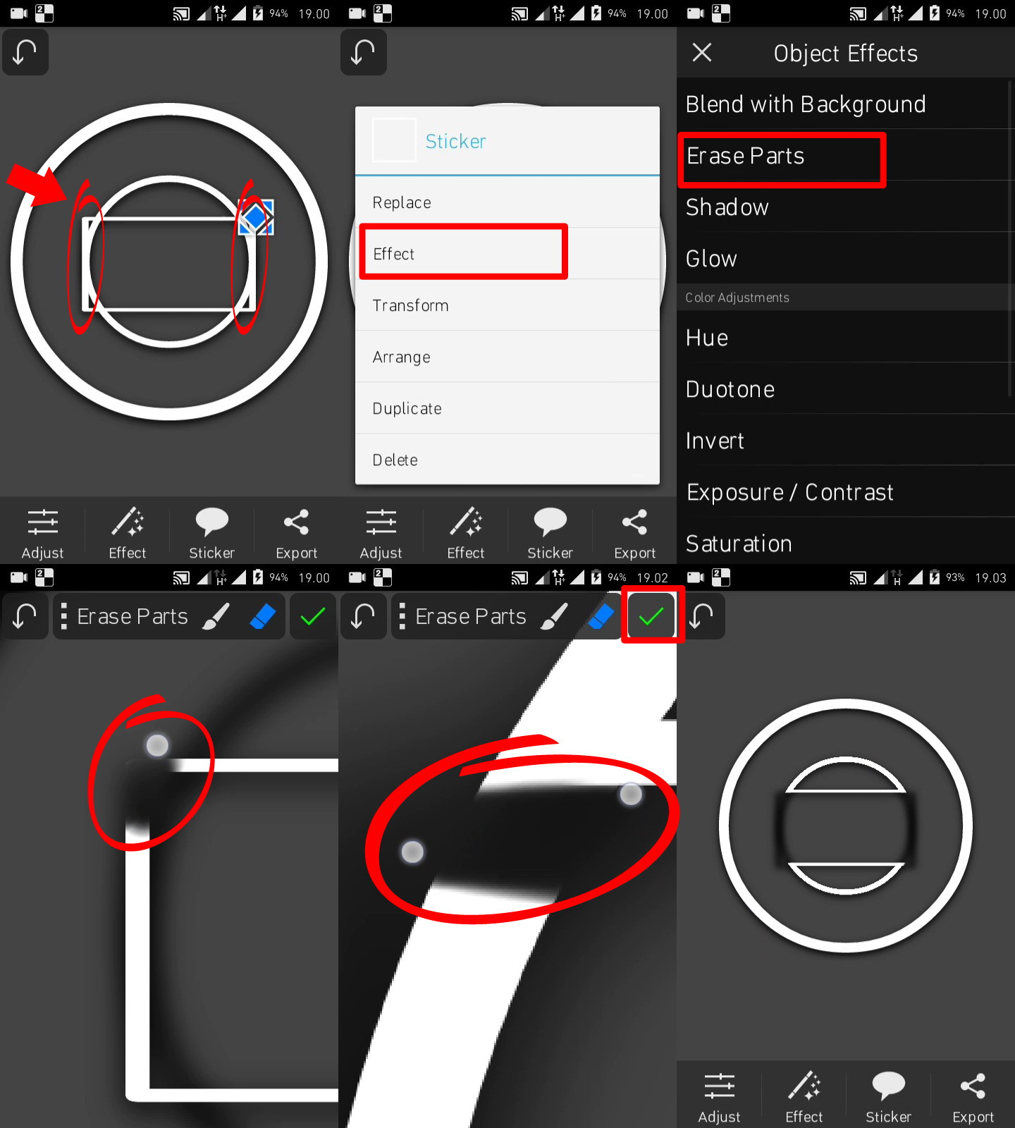 7. Selanjutnya hapus garis pada tepi kotak yang berada di tengah lingkaran tersebut sesuai contoh. Dengan cara Tap shapes kotak – erase part – lalu hapus shapes pada bagian gambar yang saya lingkari di bawah ini. Dan hasilnya bisa kalian lihat pada gambar terakhir.