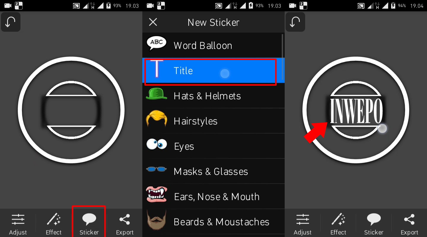 8.Pada tahap ini yaitu menambahkan text. Tap pilihan sticker – Title – ketikan suatu kata, atau inisial, lalu simpan di tengah kotak seperti gambar di bawah ini.