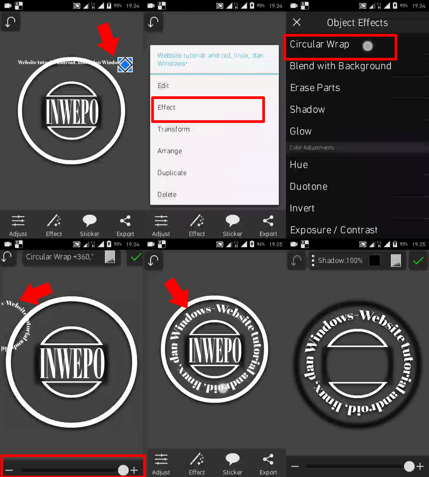 9. Tahap selanjutnya yaitu menambahkan text berputar yang akan kamu simpan di tepi lingkaran, yaitu dengan lakukan langkah sama seperti menambahkan text pada tahap sebelumnya, lalu untuk membuatnya melingkar, Tap kalimat yang akan di buat seperti melingkar – effect – Carcular Wrap, lalu atur tampilan lingkaran menjadi maximal, dan kamu bisa sesuaikan ukuran dan tata letaknya dengan tepi lingkaran seperti contoh berikut.