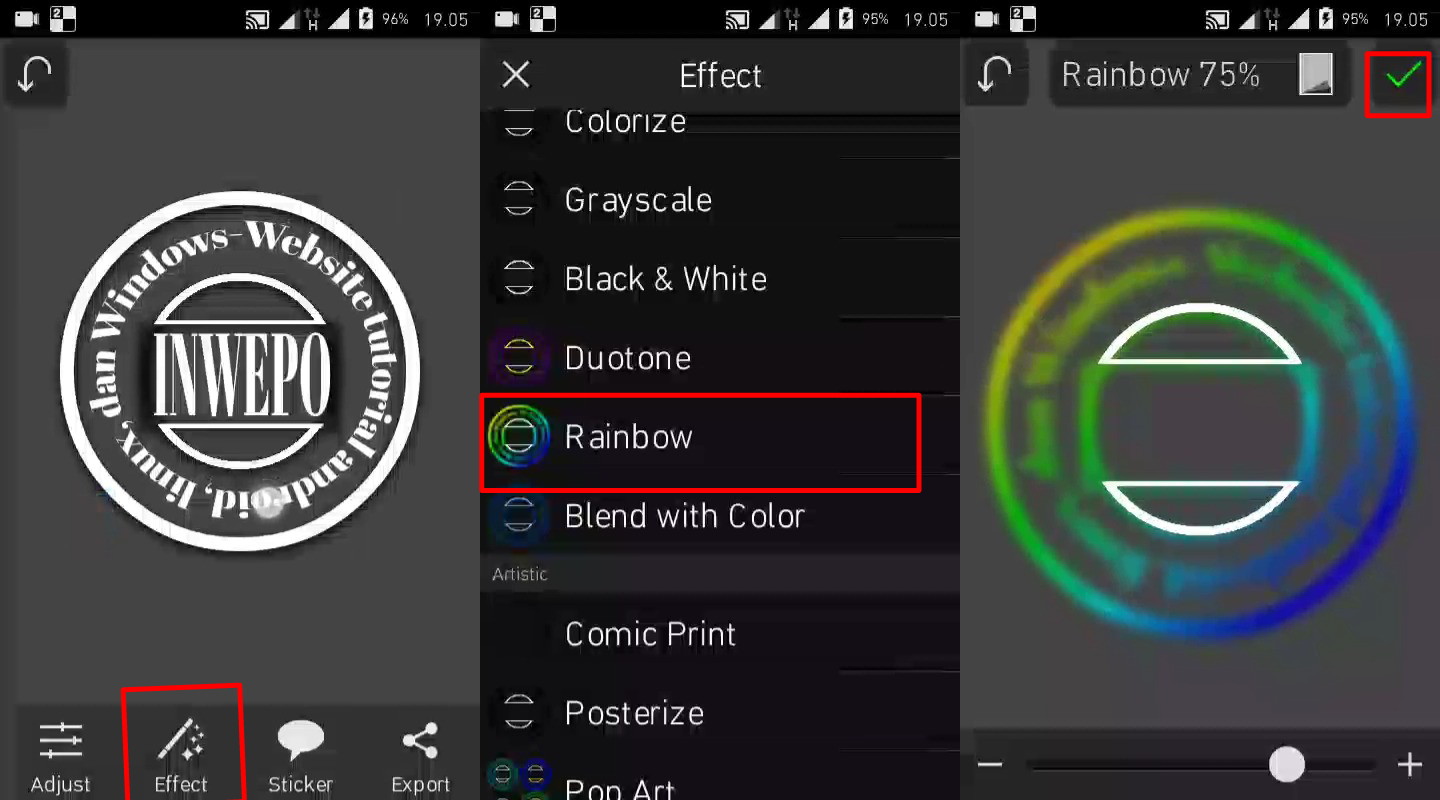 10. Pada bagian tambahkan efek rainbow glowingnya – pilih menu efect di bawah – lalu cari effect rainbow – dan tap icon ceklist di pojok kanan atas.