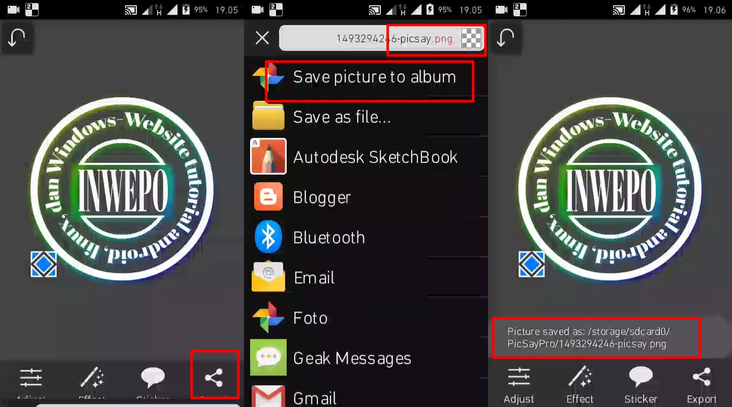 11. Pada tahap terakhir tutorial ini – tap icon share di menu bawah – Share picture to album, dan pastikan kamu tidak mengubah jenis filenya ke .jpg lalu save