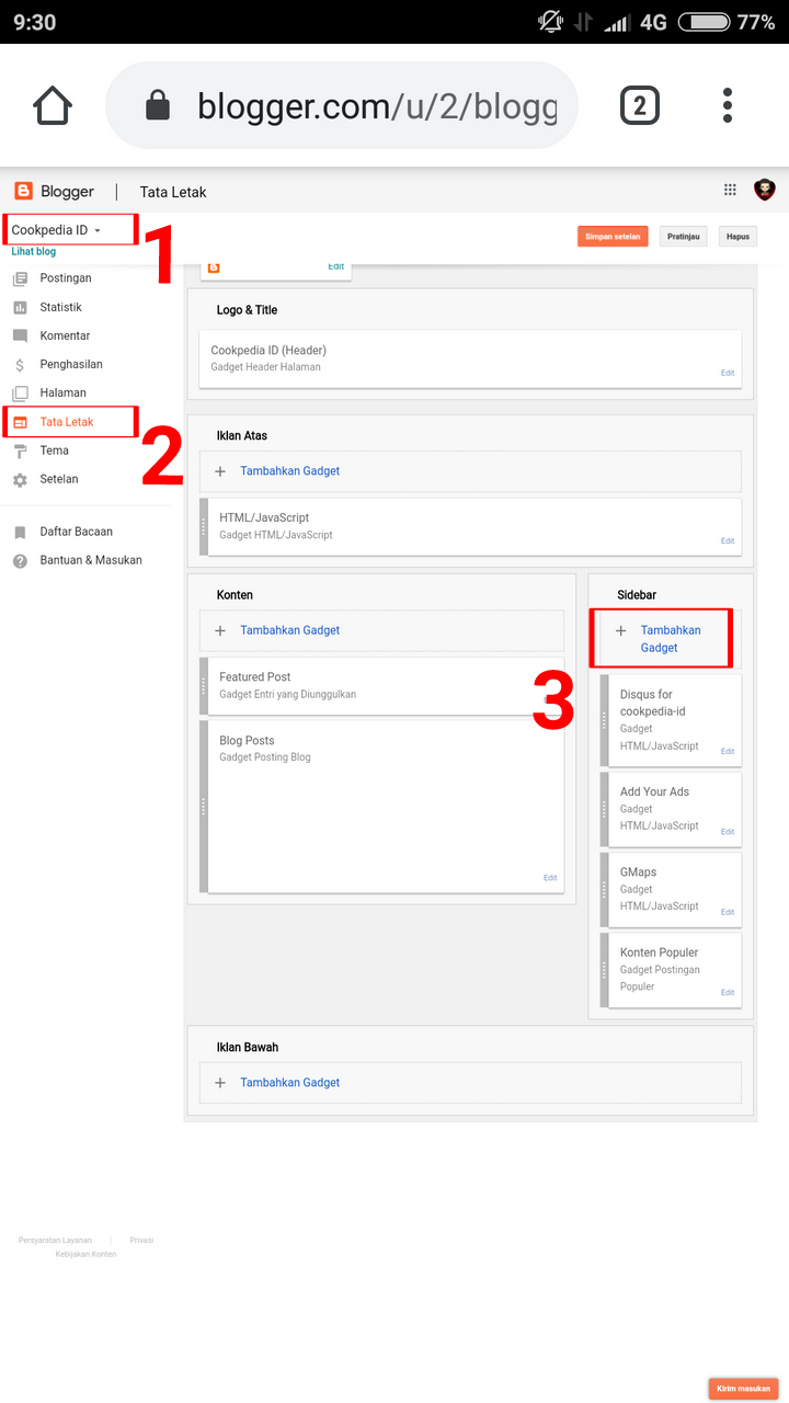 4. Selanjutnya, pilih menu Tata Letak/Layout – Tambahkan Gadget – Pilih HTML/Javascript.