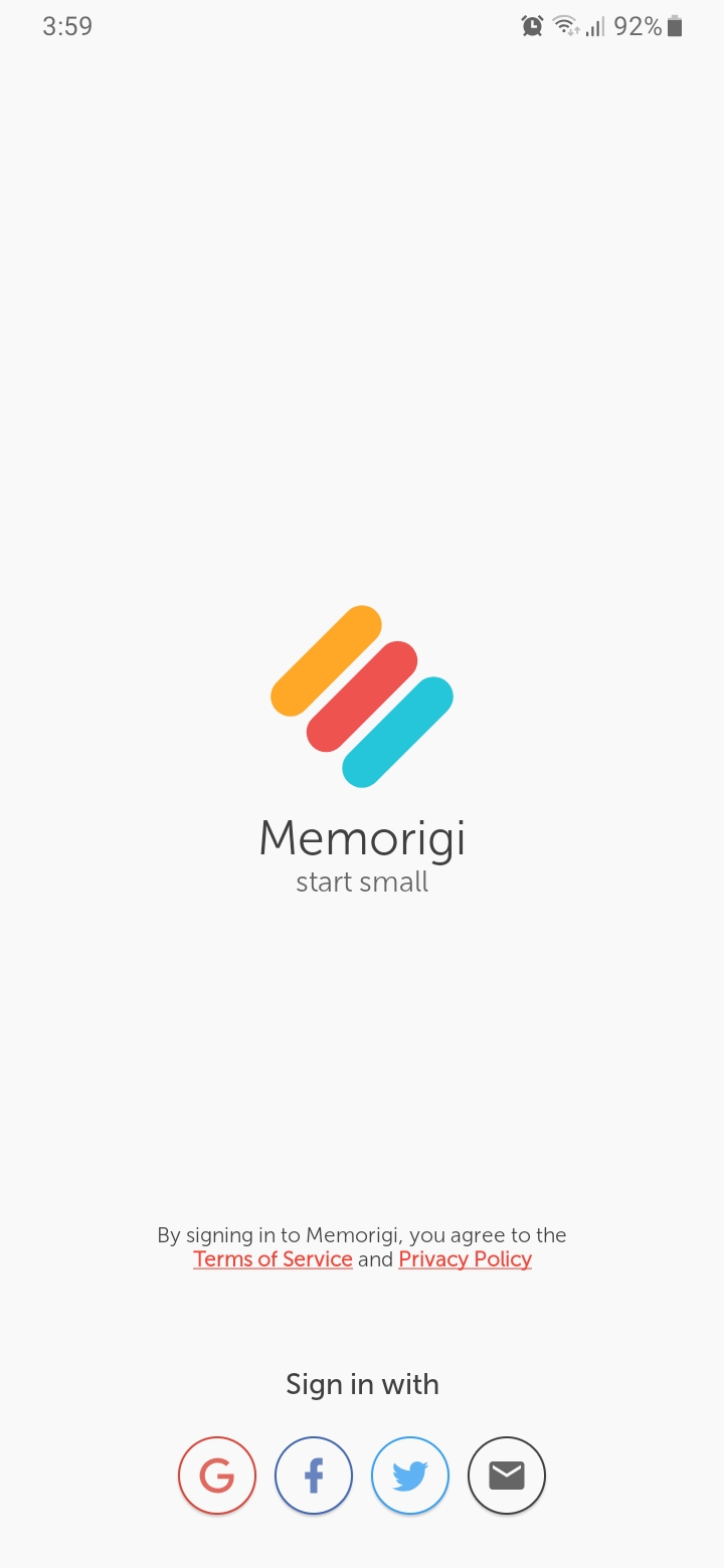 2. Bila sudah ter-install, buka aplikasi Memorigi. Lalu sign-in (bisa dengan akun Google,FB, Twitter, atau e-mail).
