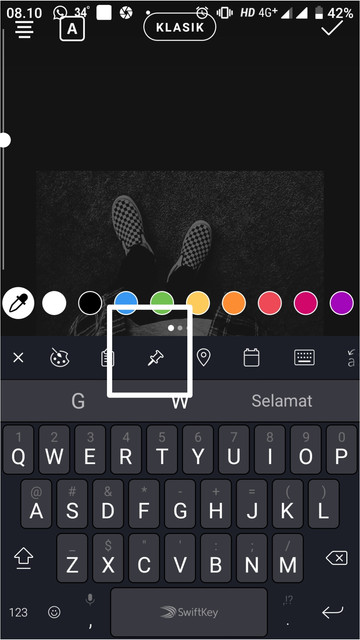 4. Langkah selanjutnya kamu pilih tombol untuk membuat Text pada instagram seperti pada biasanya, nah perhatikan bahwa triknya ada di sini, kamu tap di keyboard yang ada lambang (+) lalu cari ikon pinned/pin pada keyboard-nya.
